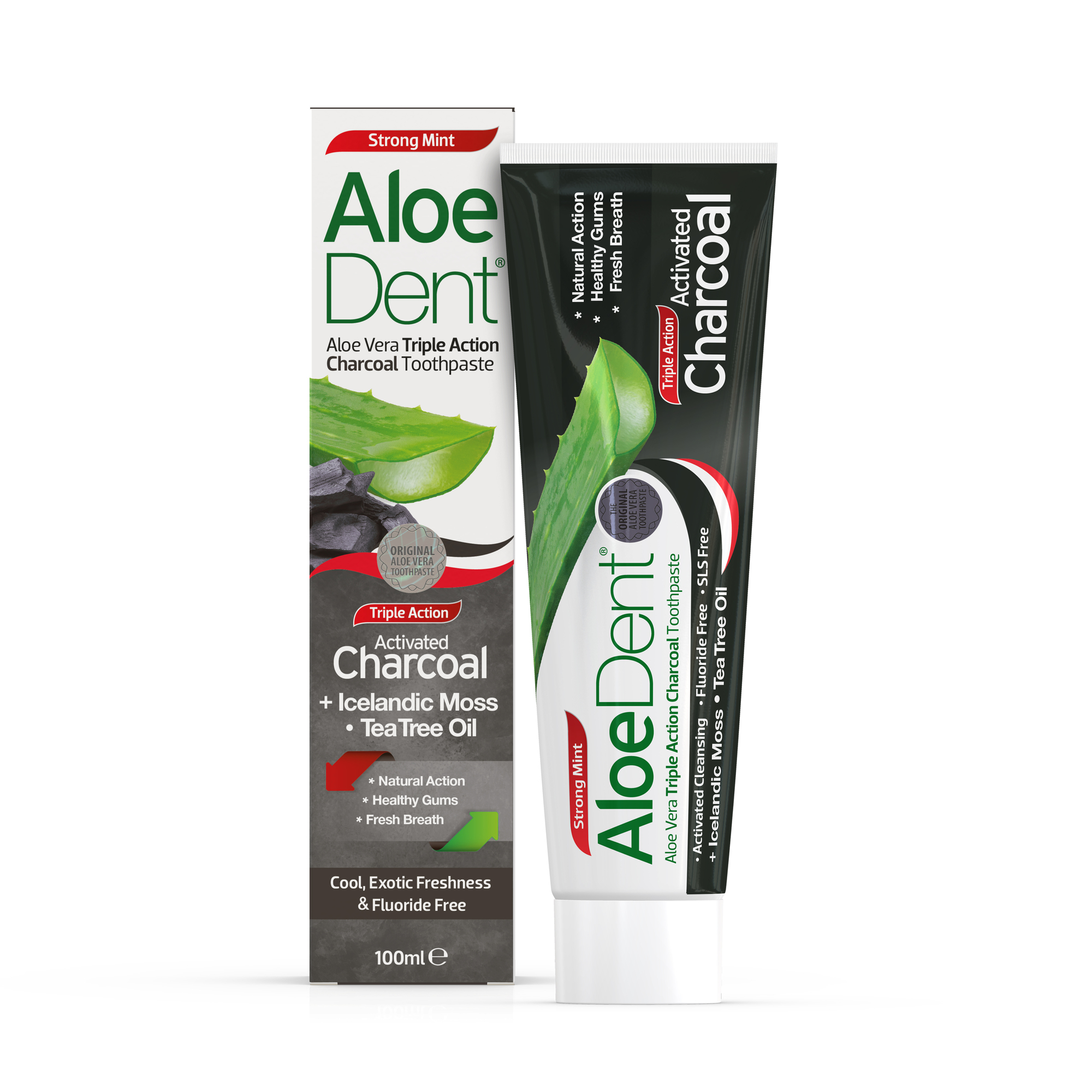 Η οδοντόκρεμα AloeDent® Triple Action Charcoal της Optima αποτελεί μια οδοντόκρεμα με τριπλή δράση που έχει ως βάση την Αλόη Βέρα αντί για νερό. Η Αλόη Βέρα έχει καταπραϋντικές ιδιότητες ενώ το έλαιο τεϊόδεντρου που περιέχει η φόρμουλα δρα ως ήπιο φυσικό αντισηπτικό.