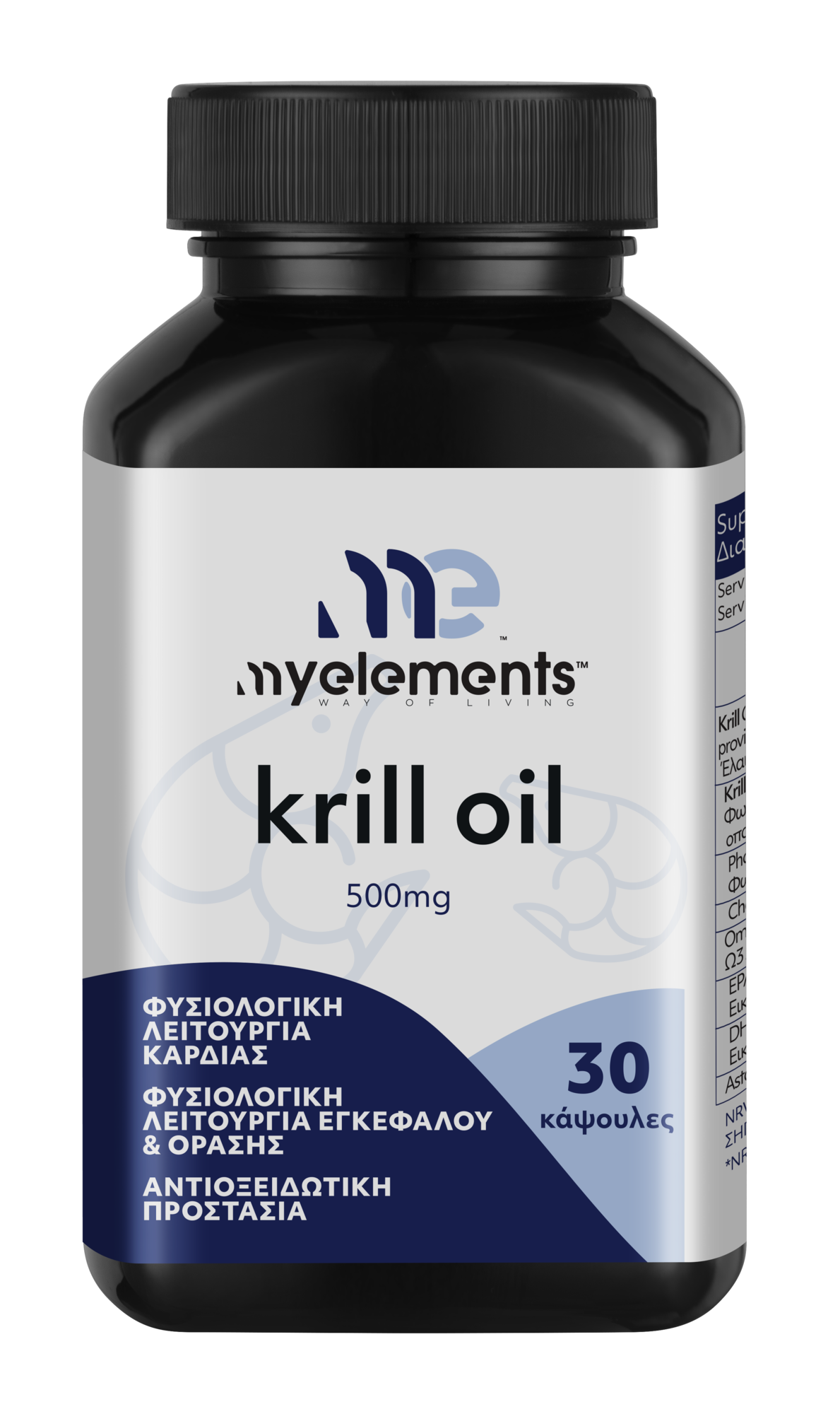 Συμπλήρωμα διατροφής με Έλαιο Krill. Είναι πλούσιο σε Ωμέγα 3 λιπαρά οξέα (EPA/DHA) που βρίσκονται σε φωσφολιπιδική μορφή όμοια με τη μορφή των κυτταρικών μεμβρανών του οργανισμού, το οποίο μεγιστοποιεί την απορρόφηση, αυξάνοντας παράλληλα και τη βιοδιαθεσιμότητα. Ακόμα, περιέχει Ασταξανθίνη, ένα καροτενοειδές, με ισχυρές αντιοξειδωτικές ιδιότητες κατά των ελευθέρων ριζών.