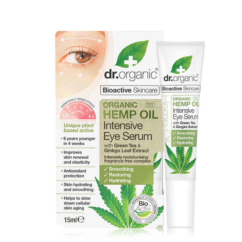 Το Organic Hemp Oil Intensive Eye Serum της dr.organic είναι ένας αντιγηραντικός ορός για τα μάτια με Έλαιο Κάνναβης και μίγμα βιοενεργών συστατικών που περιέχει εκχύλισμα φύλλου ελιάς, ginkgo, λεβάν, πράσινο τσάι και σπόρους τζιτζιφιάς. Έχει επανορθωτική δράση ενώ βοηθά στην ενυδάτωση και απάλυνση της ευαίσθητης περιοχής γύρω από τα μάτια.